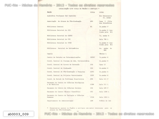 ab0003_009 | 1991 | Localização e/ou sigla de órgãos e serviços da PUC-Rio no ano de 1991. |