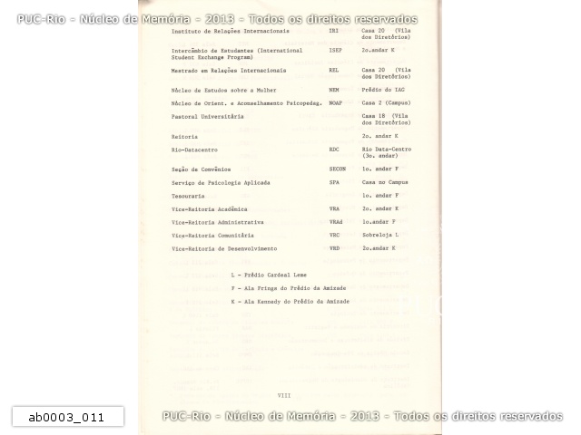 ab0003_011 | 1991 | Localização e/ou sigla de órgãos e serviços da PUC-Rio no ano de 1991. |