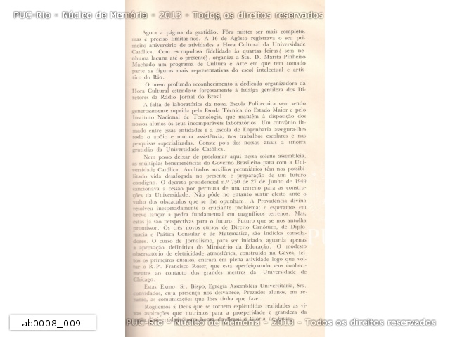 Discurso proferido pelo reitor pe. Paulo Bannwarth S.J., por ocasião da abertura solene dos cursos da Universidade Católica em 15/03/1950.