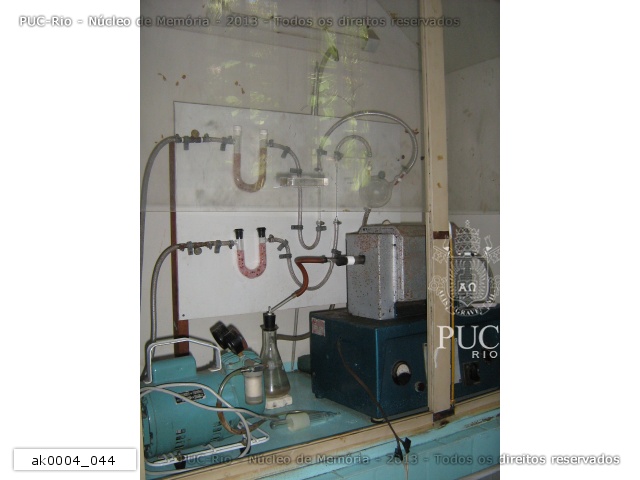 Laboratório de Engenharia Metalúrgica, localizado na casa XXI da Vila dos Diretórios. Aparentemente uma câmara de vácuo, com o compressor do lado esquerdo. Tubos e canos.