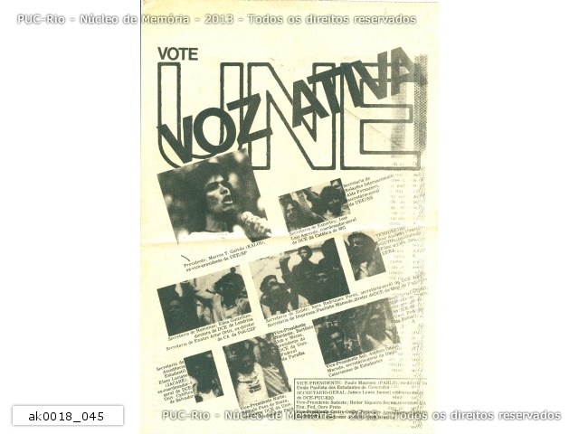 ak0018_045 | 1980 | Capa. Folheto de propaganda da chapa Voz Ativa para as eleições da UNE. Fotos, identificadas, de alguns líderes, candidatos a cargos na UNE. |