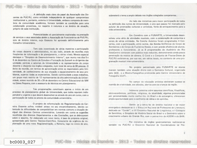 O Relatório apresenta o balanço das atividades acadêmicas da PUC-Rio do ano de 1978. A publicação contém informações do corpo docente e discente, da Associação dos Docentes (ADPUC) e da Associação de Funcionários (AFPUC), do projeto de reformulação da Regulamentação da Carreira Docente e dos convênios estabelecidos com a FUNARTE, FINEP, BNDE, MEC, IPHAN, entre outros. Destaca os projetos, os eventos, as palestras e os seminários realizados em 1978 e traz também dados sobre a situação financeira da Universidade e das bolsas de estudos. O Relatório foi apresentado pelo reitor pe. João Mac Dowell S.J. na abertura do ano acadêmico em 09 de março de 1979.