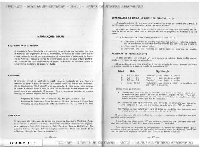 Página 96 e 97 do Catálogo Escolar do Centro Técnico Científico. Requisitos para admissão nos programas de pós-graduação; Programa do Mestrado; Currículo; Qualificação ao título de mestre em Ciências; Avaliação de aproveitamento.