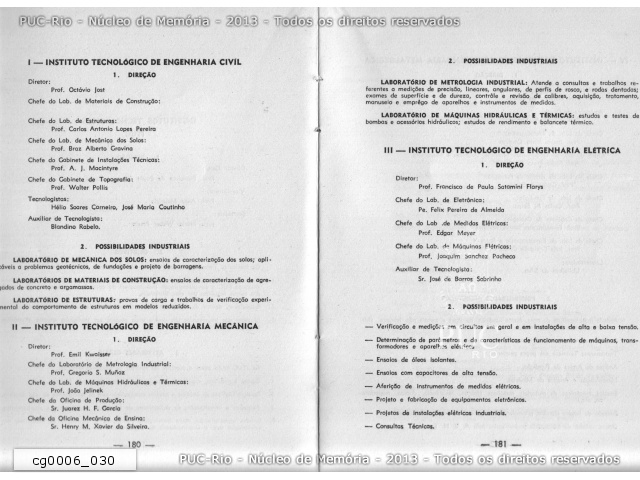 Páginas 180 e 181 do Catálogo Escolar do Centro Técnico Científico. Institutos Tecnológicos de Engenharia Civil, de Engenharia Mercânica e de Engenharia Elétrica.