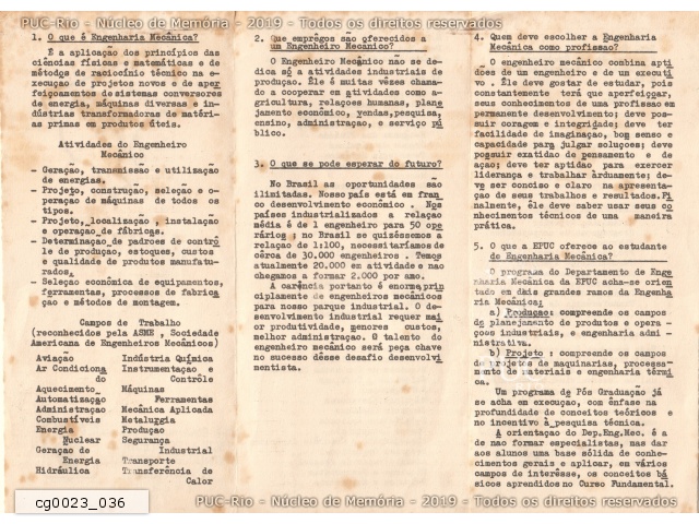 Folder sobre a Engenharia Mecânica da Escola Politécnica da PUC-Rio (verso). "O que é Engenharia Mecânica", "Que empregos são oferecidos a um Engenheiro Mecânico", "Quem deve escolher a Engenharia Mecânica como profissão", "O que a EPUC oferece ao estudante de Engenharia Mecânica".