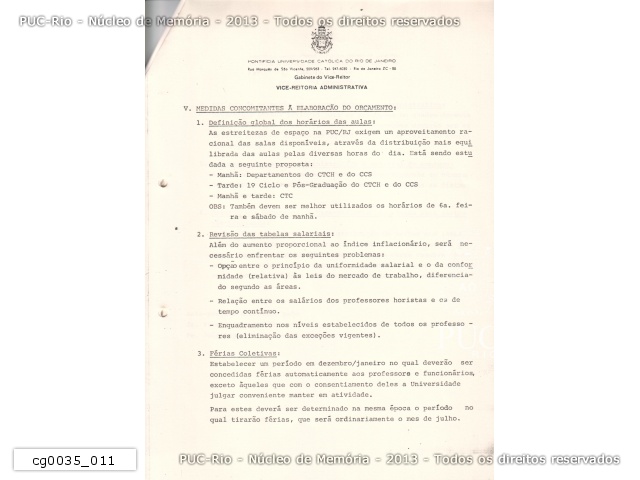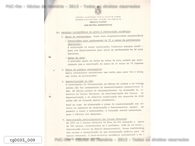 cg0035_012 | 17/9/1975 | Estudo elaborado pelo pe. João Augusto Mac Dowell S.J. para o planejamento acadêmico da PUC-Rio de 1976. O documento avalia a política acadêmica da Universidade, apresenta critérios para a distribuição dos recursos orçamentários entre as áreas, indica propostas para consolidação dos programas de Pós-Graduação e para a implantação de novos departamentos, cursos de Mestrado, Doutorado e de Especialização. O estudo aponta também para a necessidade de construção de novas instalações - salas de aula e de professores -, da reestruturação da DAR, implementação de coordenação própria para os cursos noturnos, criação de um Centro de Recursos Audiovisuais, instalação de um museu no Solar Grandjean de Montigny e da automatização da Divisão de Bibliotecas e Documentação. Ao final, o documento indica propostas para elaboração de estudo sobre a distribuição racional das salas de aula, a revisão das tabelas salariais dos professores, e o estabelecimento de um período para férias coletivas - dezembro e janeiro - e para promoção do corpo docente e administrativo. O estudo foi enviado através do ofício OF.GT-21/75 pelo presidente do Grupo de Trabalho, prof. Antonio Ernesto Camargo Wanderley, ao prof. Paulo Novaes. |