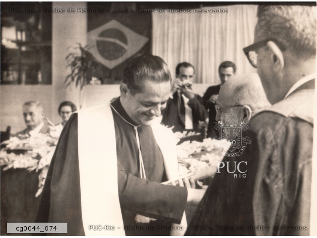 O reitor pe. Laércio entrega a medalha Cardeal Leme no evento em comemoração ao Jubileu de Prata da PUC-Rio. Na ocasião, com a presença do Embaixador da Alemanha Ocidental, foi inaugurado o prédio da Biblioteca Central e as novas instalações da Reitoria, ainda em obras, e houve o descerramento das placas aos benfeitores.