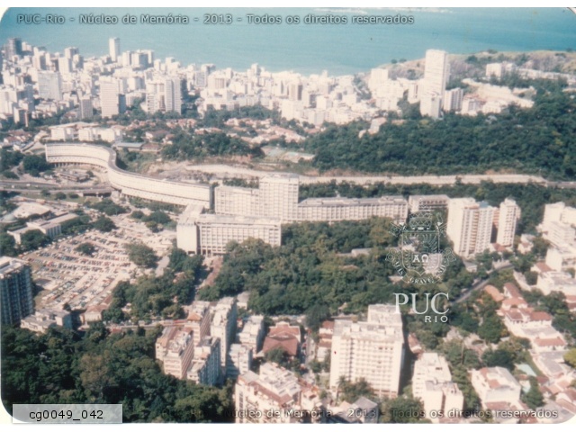 Vista aérea da PUC-Rio, ao fundo a praia do Leblon. Vê-se o Planetário, o Minhocão, a Auto-estrada Lagoa-Barra, o estacionamento, os edifícios da Amizade e Cardeal Leme e Rio Datacentro.