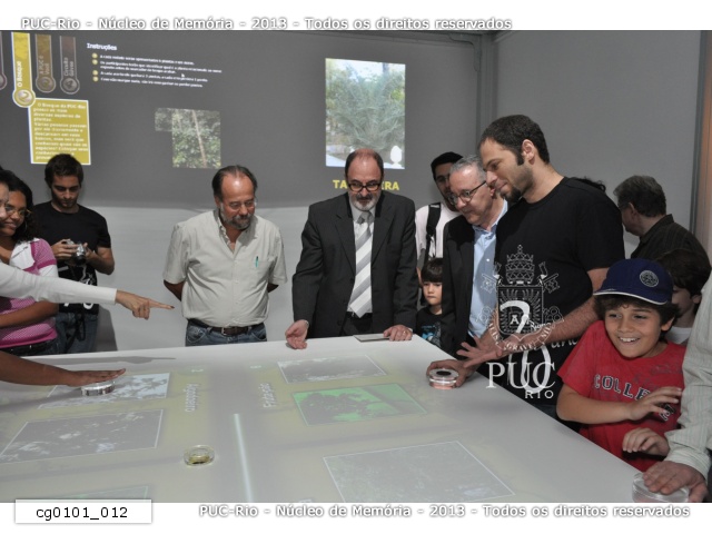 O Reitor Padre Josafá Carlos de Siqueira S.J. visita a exposição. Sala de jogos interativos em mesa digitalizadora, de memória e de conhecimentos sobre a PUC-Rio.
