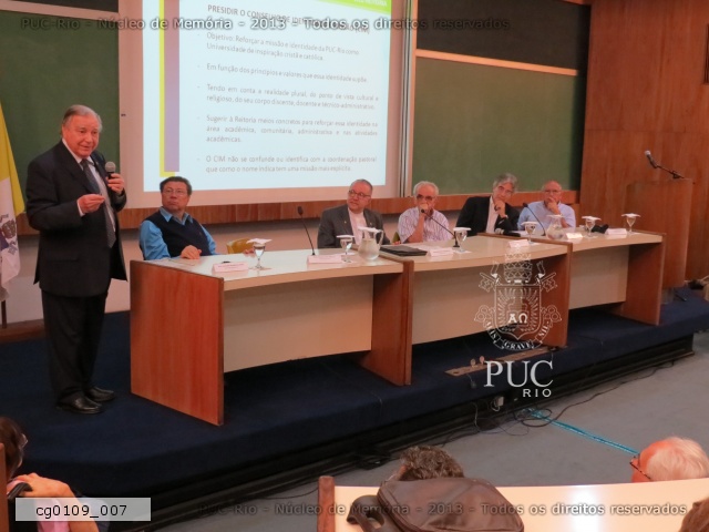 pe. Francisco Ivern Simó, S.J., prof. Luiz Carlos Scavarda do Carmo (FIS), pe. Josafá Carlos de Siqueira, S.J., pe. Pedro Magalhães Guimarães Ferreira, S.J., prof. José Ricardo Bergmann (Cetuc), prof. Augusto Luiz Duarte Lopes Sampaio (COM)