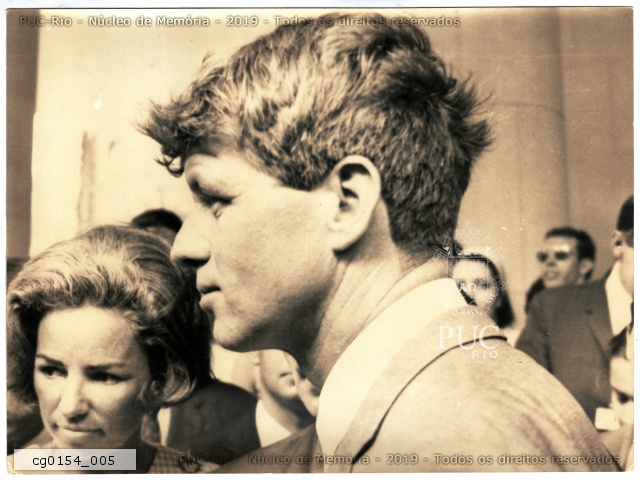 O senador Robert (Bob) Kennedy cercado pelo público presente à inauguração do busto de seu irmão, John Kennedy, nos pilotis do Edifício da Amizade. Ao lado, sua esposa, Ethel.