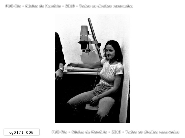 Acervo do Centro Universitário de Fotografia (CUF) recolhido pelo prof. Luiz Eduardo Teixeira Brandão (ADM) - cg0171_021 cg0171_021 1973 Pessoas na sede do CUF. Aluna sentada na janela.