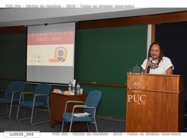 A professora Aza Njeri (LET), coordenadora do Lepecad, apresenta o escritor Wole Soyinka.