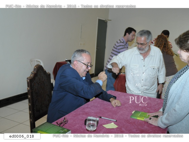 Convidado cumprimenta o Reitor Pe. Josafá S.J. na mesa de autógrafos.