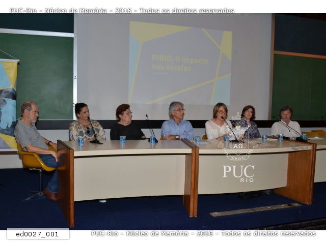 Na mesa da esq. para dir.: prof. Ilmar Rohloff de Mattos (HIS), n.i., Lígia Guedes (Diretora da Escola Municipal Christiano Hamann), prof. José Ricardo Bergmann (CETUC, Vice-Reitor para Assuntos Acadêmicos), profa. Maria Rita Passeri Salomão (EDU), profa. Daniela Trejos Vargas (JUR) e prof. Ralph Ings Bannell (EDU)