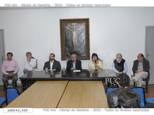 Da esq. para dir.: prof. Luiz Carlos Scavarda do Carmo (FIS, Vice-Reitor para Assuntos Administrativos), prof. José Ricardo Bergmann (CETUC, Vice-Reitor para Assuntos Acadêmicos), prof. Augusto César Pinheiro da Silva (GEO), prof. pe. Josafá Carlos de Siqueira S.J. (BIO, Reitor), profa. Regina Célia de Mattos (GEO), prof. pe. Francisco Ivern Simó S.J. (Vice-Reitor), prof. Luiz Roberto Azevedo Cunha (ECO, Decano CCS).