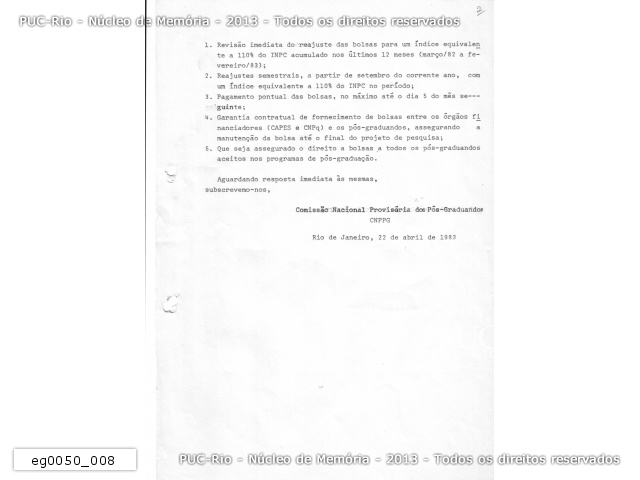 Tratam de assuntos variados, como encontros e correspondências com a Coordenação Nacional Provisória de Pós-Graduandos, solicitação encaminhada ao governador Leonel Brizola sobre a utilização de um prédio, agradecimento ao Reitor da PUC-Rio Pe. Laércio de Moura pelo encontro com a CNPPG, debate sobre o índice de reajuste das bolsas de estudo, convocação para Assembleia geral dos Pós-Graduandos, reunião preparatória para o V Encontro Nacional de Pós-Graduandos, dificuldades da participação de Pós-Graduandos na APG, sugestões dos Pós-Graduandos da PUC-Rio para a política educacional e sobre a situação da Pós-Graduação no país, carta para a comunidade acadêmica sobre a nota atribuída ao Mestrado em Psicologia, campanha sobre as Diretas Já, e carta para o candidato à presidência Tancredo Neves sobre o reconhecimento da Pós-Graduação no Brasil.