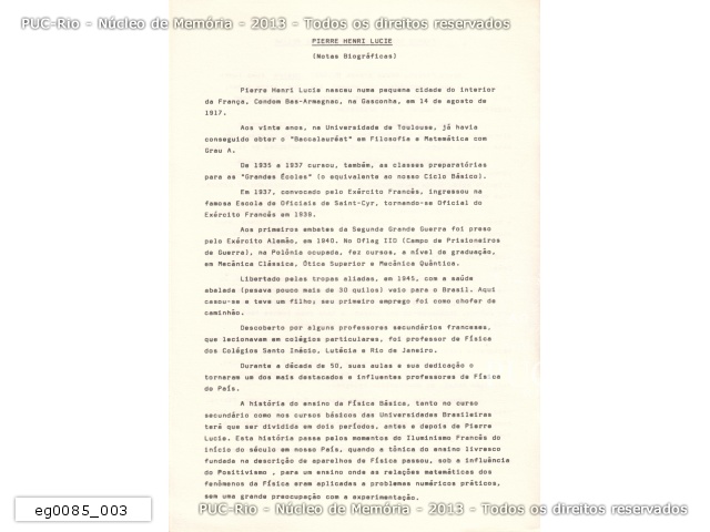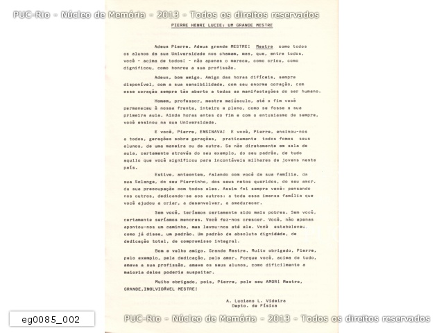 eg0085_002 | 1985 | Pierre Henri Lucie: um grande mestre. Texto do prof. A. Luciano L. Videira. |
