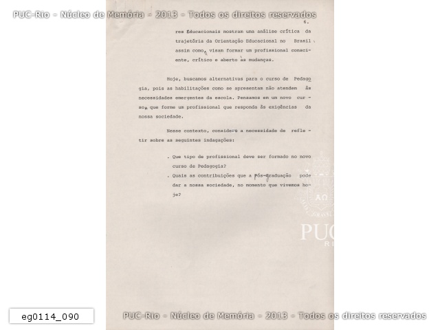 eg0114_022 | 11/1986 | Artigo intitulado 'Pós-Graduação e competência política', de autoria da professora Glaura Vasquez de Miranda, apresentado no Seminário dos 20 anos do mestrado em Educação da PUC-Rio. |