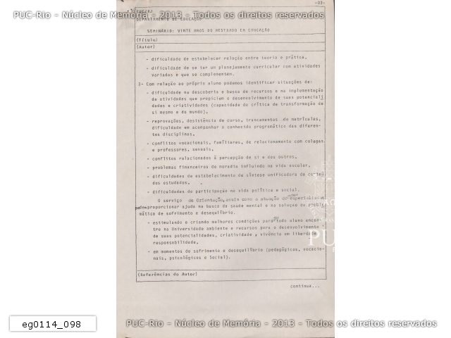 eg0114_078 | 19/11/1986 | Artigo intitulado 'Do Aconselhamento Psicopedagógico à Psicopedagogia', de autoria da professora Maria Apparecida Campos Mamede Neves, apresentado no Seminário dos 20 anos do mestrado em Educação da PUC-Rio. |