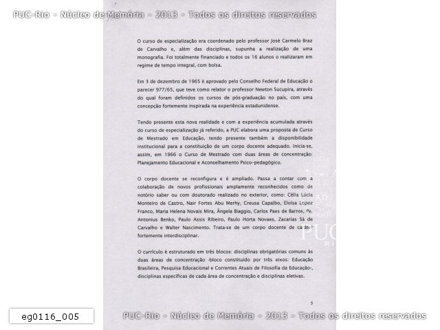 José Carmelo Braz de Carvalho (prof. EDU), Newton Lins Buarque Sucupira (relator CFE), Célia Lúcia Monteiro de Castro (profa. EDU), Nair Fortes Abu Merhy (profa. EDU), Creusa Capalbo (profa. FIL), Eloísa Lopez Franco (profa. EDU), Maria Helena Novaes Mira (profa. EDU), Angela Maria Brasil Biaggio (profa. PSI), Carlos Paes de Barros (prof. PSI), pe. Antonius Benkö, S.J. (prof. PSI), Paulo Assis Ribeiro (prof. EDU), Paulo Horta Novaes (prof. EDU), José Zacharias Sá Carvalho (CAPES), Walter Nascimento (prof. EDU)