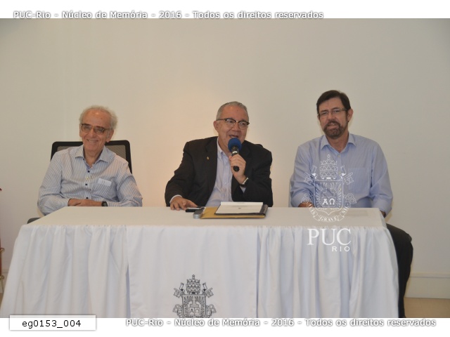 Da esq. para dir.: prof. pe. Pedro Magalhães Guimarães Ferreira S.J. (FPLF), prof. pe. Josafá Carlos de Siqueira S.J. (GEO, Reitor) e o prof. Luiz Alencar Reis da Silva Mello (CETUC, Decano do CTC)