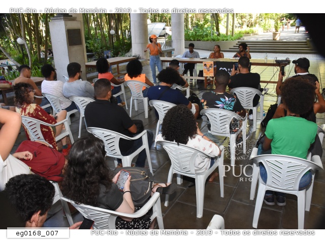 Na mesa da esq. para dir.: n.i., aluno Lucas Adeniran (COM), da profa. Aza Njeri (LET) e Wesley Teixeira (ONG Coalizão Negra Por Direitos)