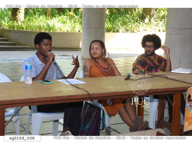 O aluno Lucas Adeniran (COM) participa do evento ao lado da profa. Aza Njeri (LET) e de Wesley Teixeira (ONG Coalizão Negra Por Direitos).