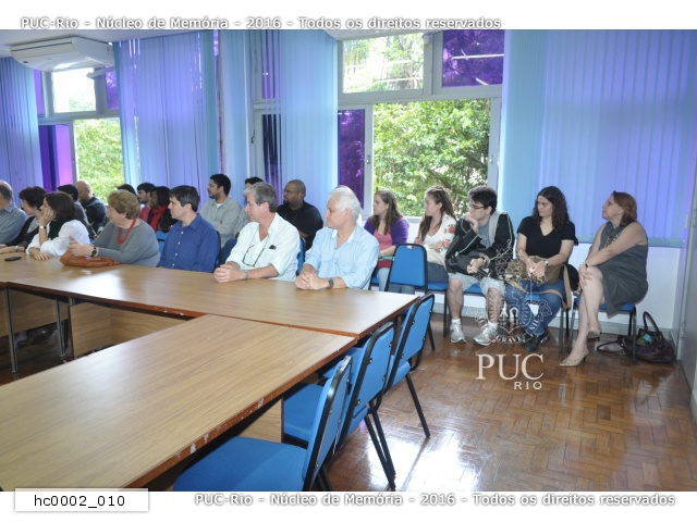 Da esq. para a dir.: 1ª fila - prof. Ilmar Rohloff de Mattos (HIS); profa. Selma Rinaldi de Mattos (HIS); profa. Eunícia Barros Barcelos Fernandes (HIS); profa. Margarida de Souza Neves (Núcleo); prof. Leonardo Affonso de Miranda Pereira (coordenador de graduação HIS), prof. Raul Almeida Nunes (DEMA), prof. Moises Henrique Szwarcman (ELE)