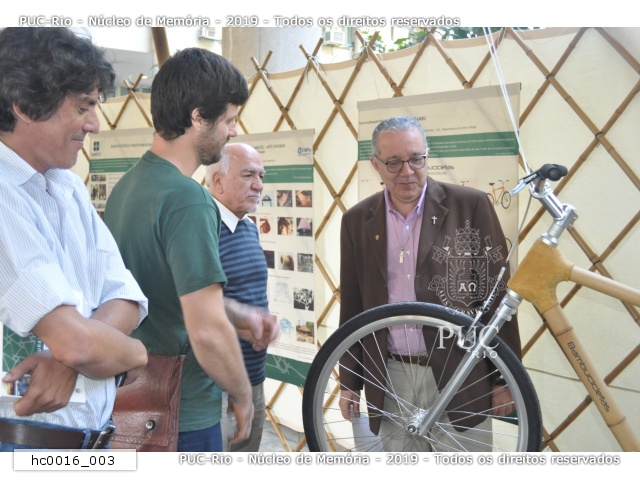 O Reitor pe. Josafá S.J. na abertura da exposição Mostra 2011, de estruturas de bambu, com a Bambucicleta, bicicleta feita à base de bambu.