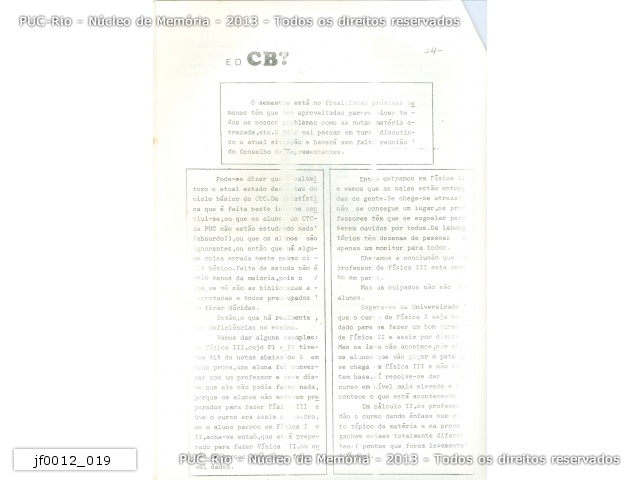 jf0012_019 | 6/1978 | página 04. E o CB? Estudantes atribuem as notas ruins à deficiência no ensino do CTC. |