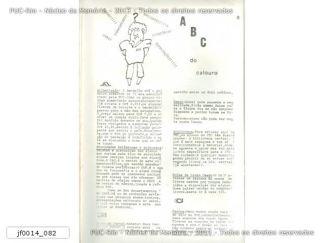 Página 08. ABC do Calouro. Sobre alimentação no campus, cultura, banca de jornal, agência bancária, biblioteca, carona.