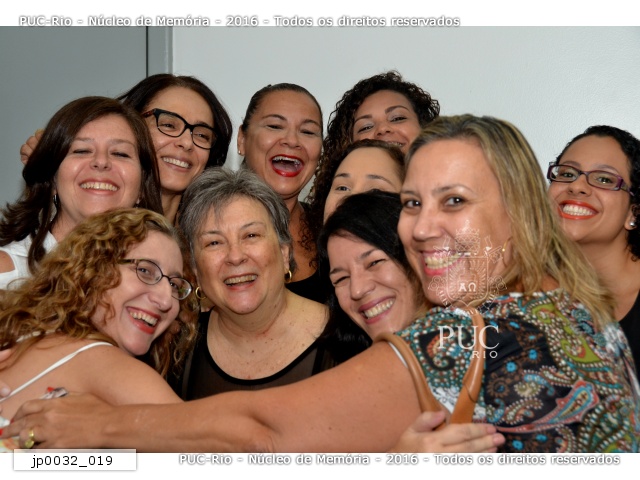 A nova Diretora do Departamento de Comunicação Social da PUC-Rio, professora Angeluccia Habert, recebe abraço de mulheres presentes após a cerimônia de posse.