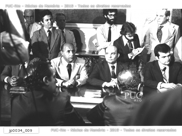 Na mesa, sentados, da esq. para dir.: 2º - pe. João Augusto Anchieta Amazonas Mac Dowell S.J. (Reitor); 3º - Marcio Fortes.