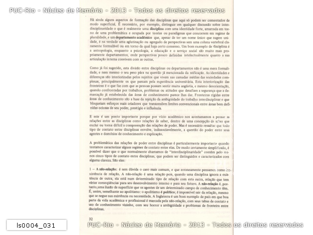 Continuação do texto do professor Sérvulo Augusto Figueira do Departamento de Psicologia sobre a interdisciplinalidade das ciências humanas. O autor faz um diferenciação entre disciplinas e departamentos, onde, antropologia é apresentada como disciplina e educação, serviço social e psicologia como departamentos. O professor classifica ainda cinco tipos de contatos entre as disciplinas, nesta página o primeiro deles.