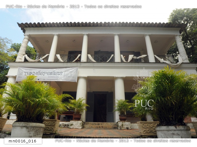 Fachada do Solar Grandjean de Montigny com faixa da exposição TEKNÓSPOIÉSIS - Poéticas do Oral ao Digital - Uma experiência para todos os sentidos.