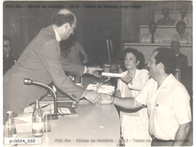 Adalberto Pereira, prefeito do campus da PUC-Rio, recebe, através do reitor Padre MacDowell S.J., a homenagem e o cumprimento da Universidade pelos mais de vinte anos de trabalho dedicados a ela.