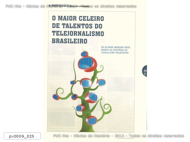 Matéria da Revista PONTES, n°1, sobre o sucesso dos ex-alunos da PUC-Rio no jornalismo televisivo brasileiro. A PUC-Rio, 'O maior celeiro de talentos do telejornalismo brasileiro'. (página 25)