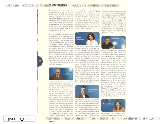 Matéria da Revista PONTES, n°1, sobre o sucesso dos ex-alunos da PUC-Rio no jornalismo televisivo brasileiro. A PUC-Rio, 'O maior celeiro de talentos do telejornalismo brasileiro'. (página 26)