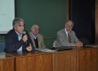 pv0013_003 | 4/7/2011 | O reitor Padre Josafá e o vice-reitor acadêmico Professor José Bergmann na abertura da palestra do presidente da CAPES, Professor Jorge Guimarães, que na sequência apresentou o Plano Nacional de Pós-Graduação 2011-2020 a representantes da administração central e outros professores da PUC-Rio. |