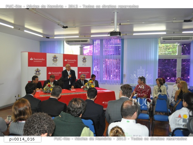 O reitor Padre Josafá fala na cerimônia de assinatura do convênio de apoio à Agenda Ambiental PUC-Rio e Santander Universidades. À mesa, além dos representantes da PUC-Rio, estão Jamil Hannouche, vice-presidente, e Afrânio Pereira, superintendete do Grupo Santander Universidades.