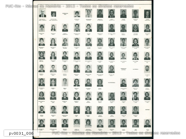 Parte do convite de formatura de todas as turmas do Centro Técnico e Científico de 1976, com fotos de formandos, professores e homenageados. Cursos de Engenharia Civil, Elétrica, Eletrônica, Eletrotécnica e Sistemas.