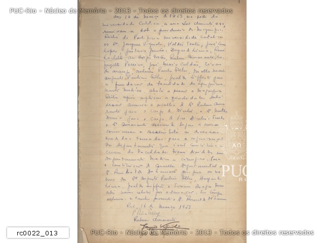 Ata de fundação da Faculdade de Aperfeiçoamento Médico (Escola Médica de Pós-Graduação). Assinaturas do reitor Pe. Velloso S.J., do prof. Rubem Amarante, do prof. Jayme Vignolo [?] e do pe. José Leme Lopes S.J..