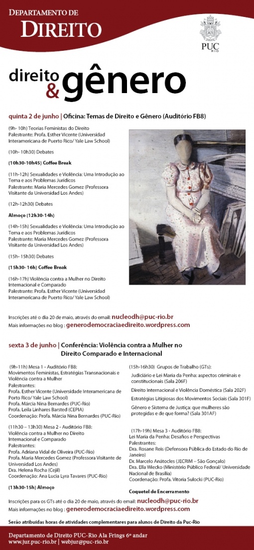 A conferência Violência contra a mulher no Direito Comparado e Internacional foi organizada pelo Departamento de Direito e contou com palestras e grupos de trabalho sobre os seguintes temas: Movimentos feministas, estratégias transnacionais e violência contra a mulher; Violência contra a mulher no Direito Internacional e Comparado; Judiciário e Lei Maria da Penha: aspectos criminais e constitucionais; Direito Internacional e violência doméstica; Estratégias litigiosas dos movimentos sociais; Gênero e sistema de justiça: que mulheres são protegidas e de que forma?; Lei Maria da Penha: desafios e perspectivas.