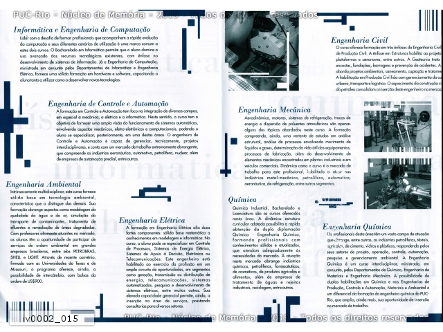 iv0002_015 | 2005 | Descrição básica de alguns cursos do Centro Técnico Científico (CTC): Informática e Engenharia de Computação, Controle e Automação, Ambiental, Elétrica, Civil, Mecânica, Química, Engenharia Química. |