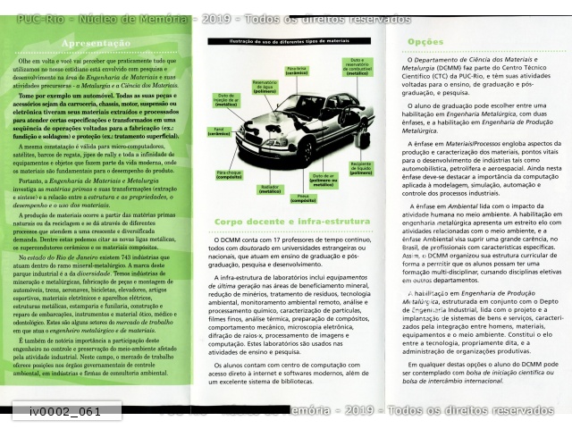 iv0002_061 | 2005 circa | Apresentação do curso de Engenharia de Materiais e Metalurgia. Corpo docente e infraestrutura. Opções (habilitações). Ilustração com um automóvel. |