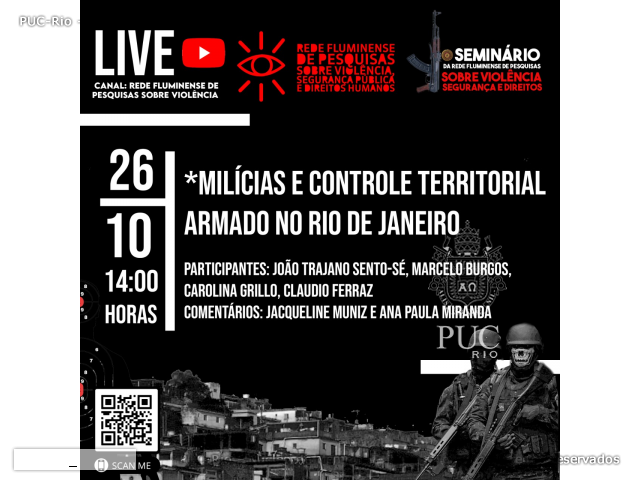 Com o tema Milícias e controle territorial armado no Rio de Janeiro. Participantes: Prof. João Trajano (UERJ), Prof. Marcelo Burgos (CIS), Profa. Carolina Grillo (UFF) e Prof. Cláudio Ferraz (ECO).