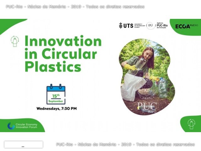 Tema: Innovation in Circular Plastics. Palestrantes: Murray Hyde, do COO - The Plastics Circle, e Warwick Armstrong, Business Development Manager, Plantic Technologies Ltd. Organização: University of Technology Sidney (UTS), Agência PUC-Rio de Inovação e ECOA.