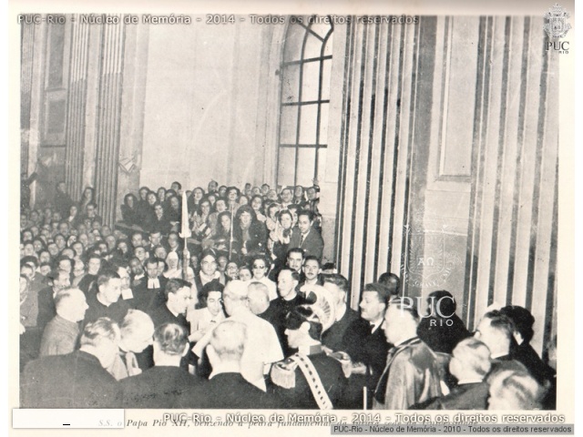 O Papa Pio XII abençoa a pedra fundamental da futura sede da PUC-Rio na Gávea. > O Papa Pio XII abençoa a Pedra Fundamental da PUC-Rio. Durante visita de peregrinos da PUC-Rio ao Vaticano nas comemorações do Ano Santo, o Papa Pio XII abençoa a Pedra Fundamental da PUC-Rio.