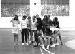 Alunas posam após jogo de futebol de salão. Na parede ao fundo, um cartaz de show do Di Castro. |